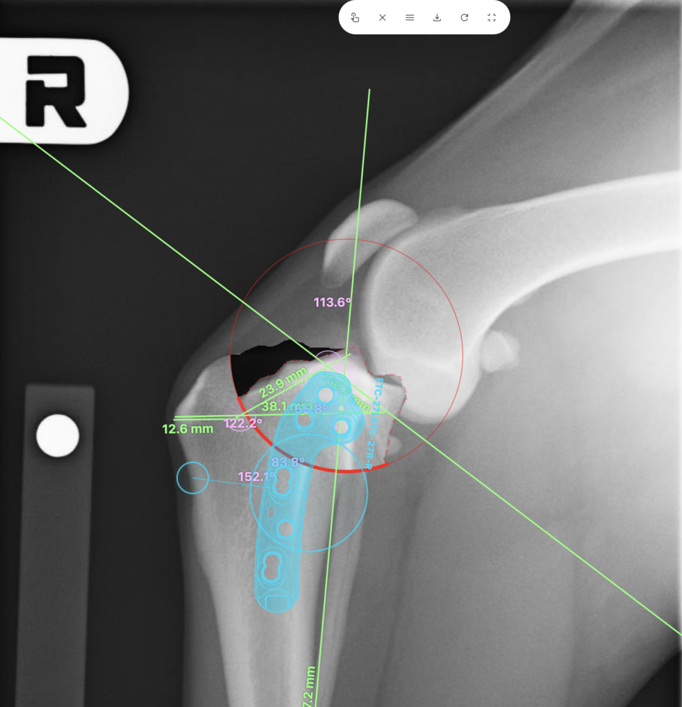 脛骨の形を外科的に変えることで、靭帯がなくても膝が安定するようにする術式です。